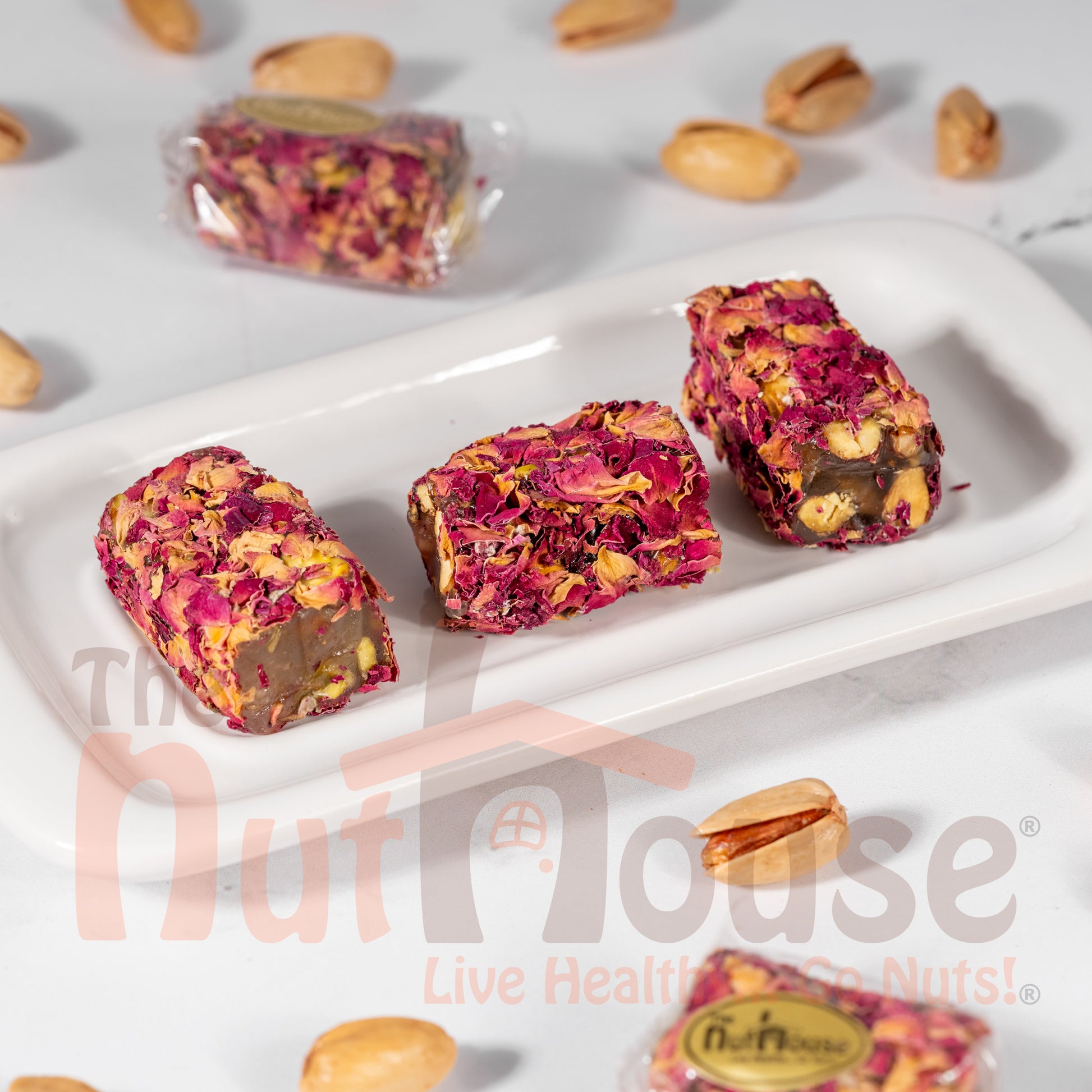 Aleppo Pistachio Rahet Ward features a soft and delicately sweet confection infused with pistachio flavor. “Rahet Ward,” traditionally known for its smooth texture, offers a tender bite complemented by the rich nuttiness of pistachios.
