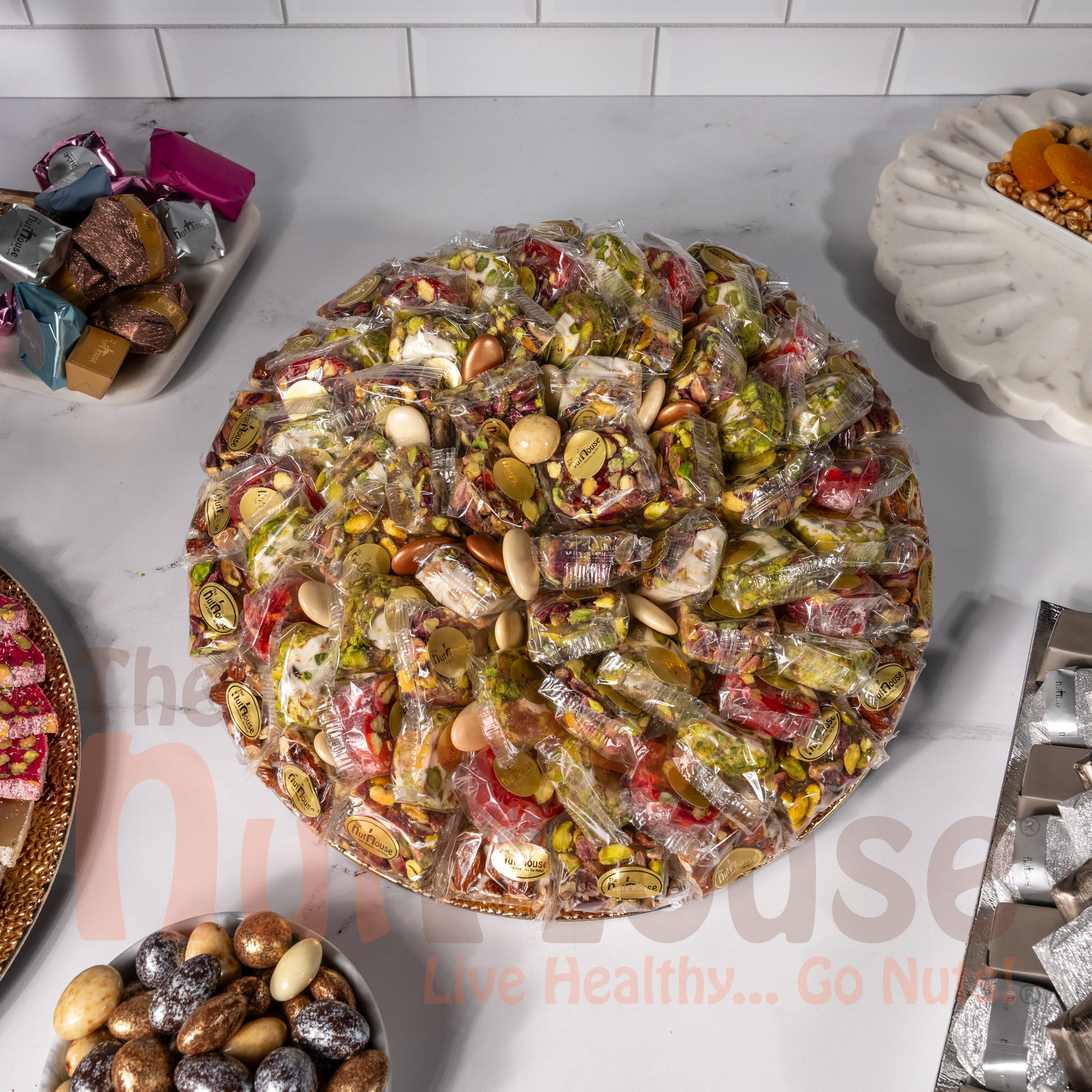 Thoughtfully assembled to maintain freshness and visual appeal, this tray reflects traditional confectionery artistry. To preserve softness and flavor, store Deluxe Nougat and Raha Gift Tray in a cool, dry place and keep covered when not in use. It offers a refined and versatile sweet assortment suitable for special occasions.