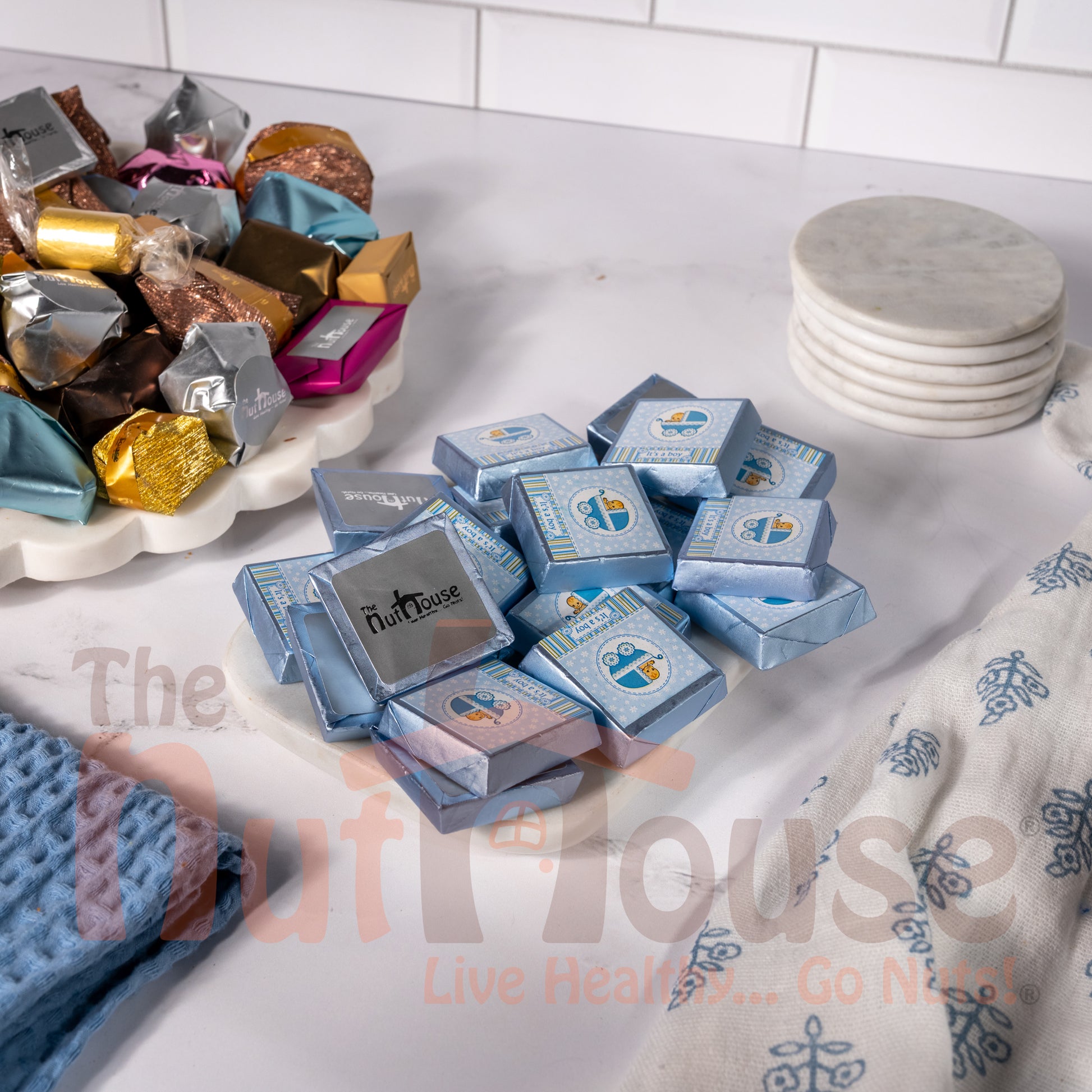 Its a Boy Chocolate Crushed Nuts & Hazelnut Cream features smooth chocolate filled with creamy hazelnut and coated with crushed nuts. The nut coating enhances texture, while the hazelnut center provides rich and balanced sweetness.