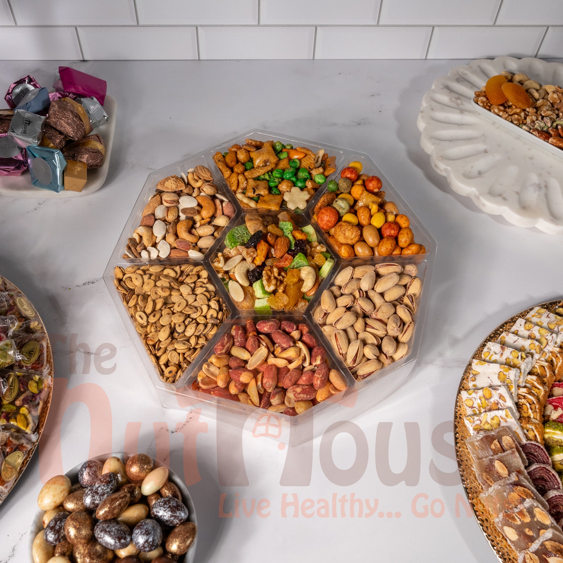 The larger number of sections makes it especially suitable for gatherings, celebrations, or gifting occasions where variety is appreciated. Each compartment keeps the snacks separate, maintaining freshness and allowing guests to choose their favorites easily. Mixed Snack Box 7 Sections combines practicality with an elegant presentation.